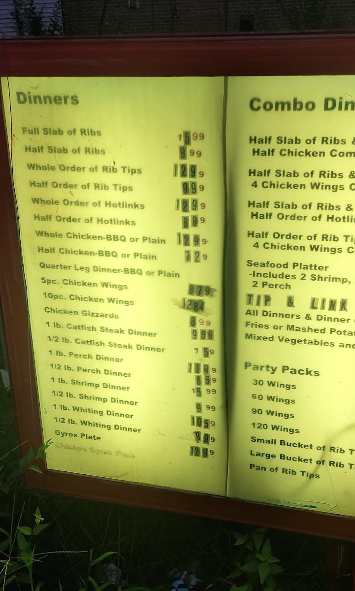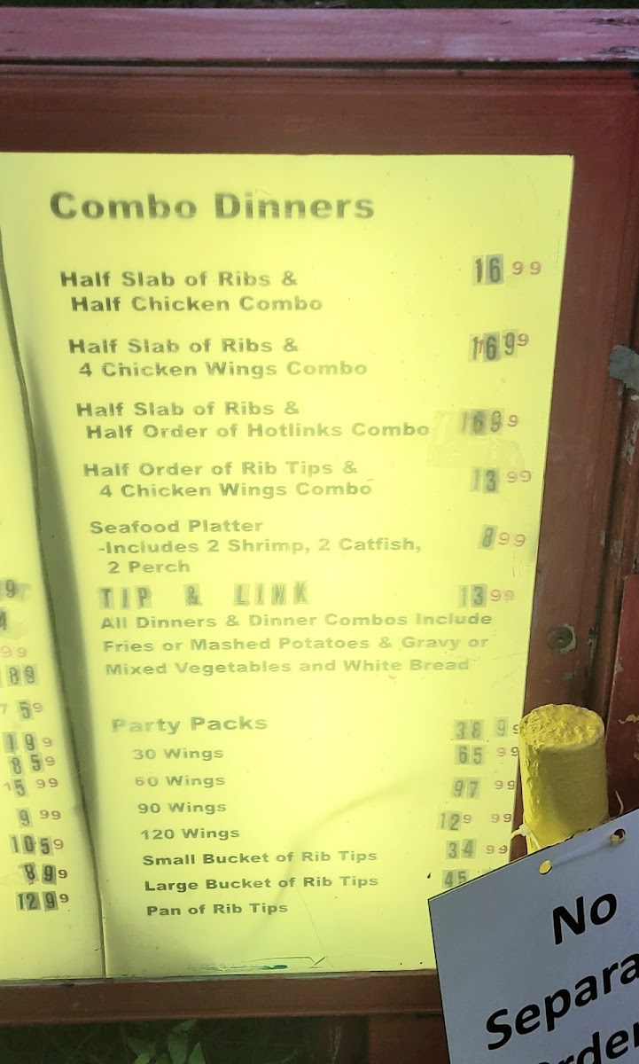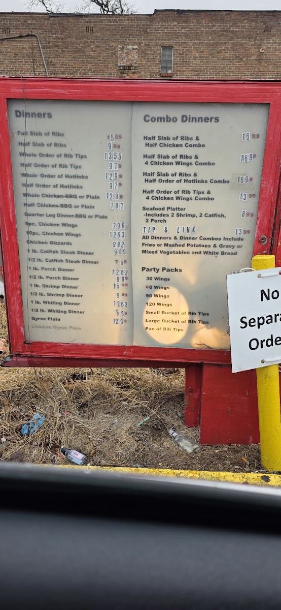 Classic barbecue dishes take center stage, with items like Italian Beef and the Wing N Link Combo providing familiar, satisfying flavors. Alongside these, there are casual bites like fries served with a distinctive sauce and a gyro with BBQ sauce, blending traditional tastes with a unique twist. The menu also includes generous seafood dinners and burger and sandwich options, making it easy to find something for every mood.